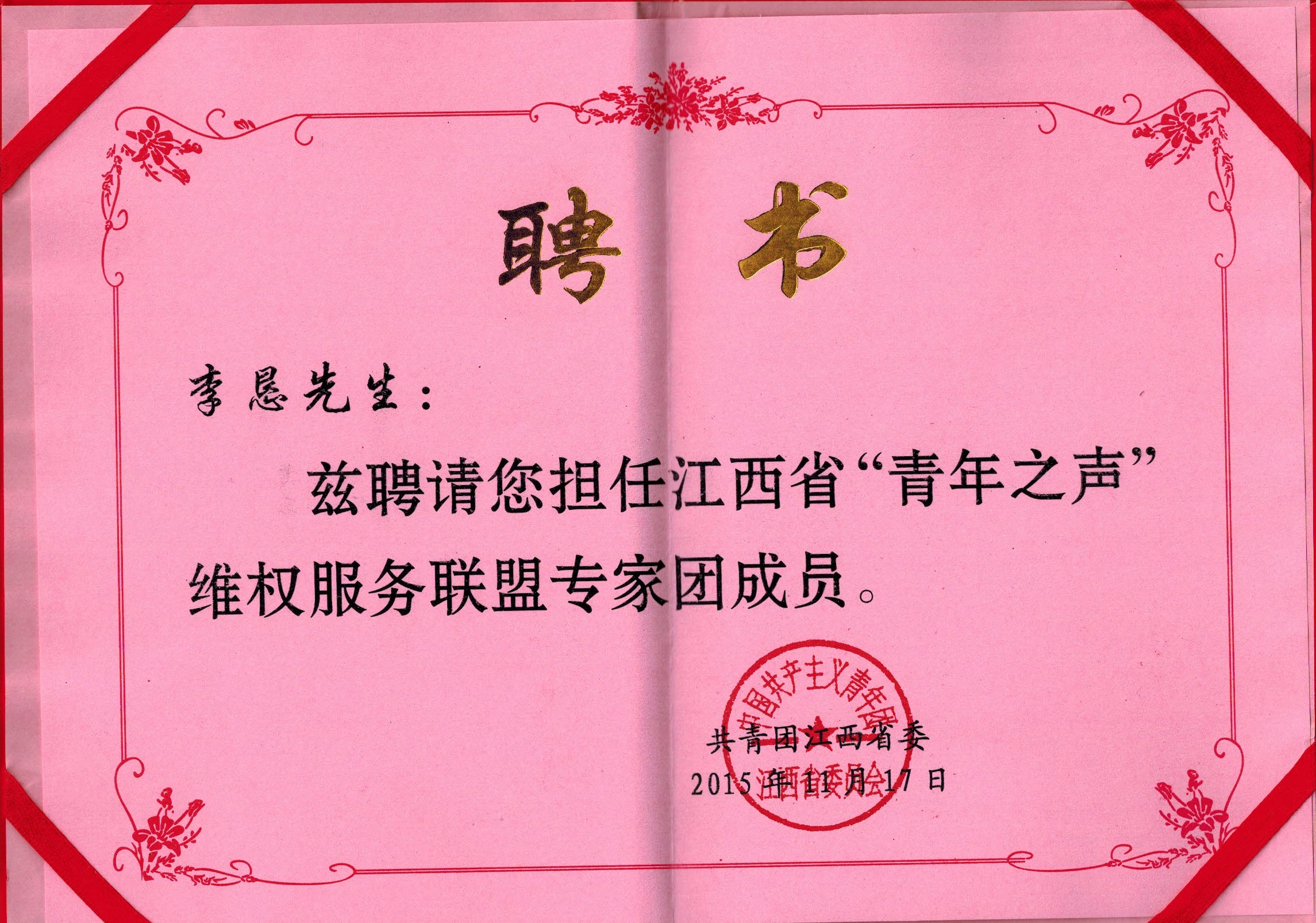 李恳律师被聘为江西省“青年之声”维权服务联