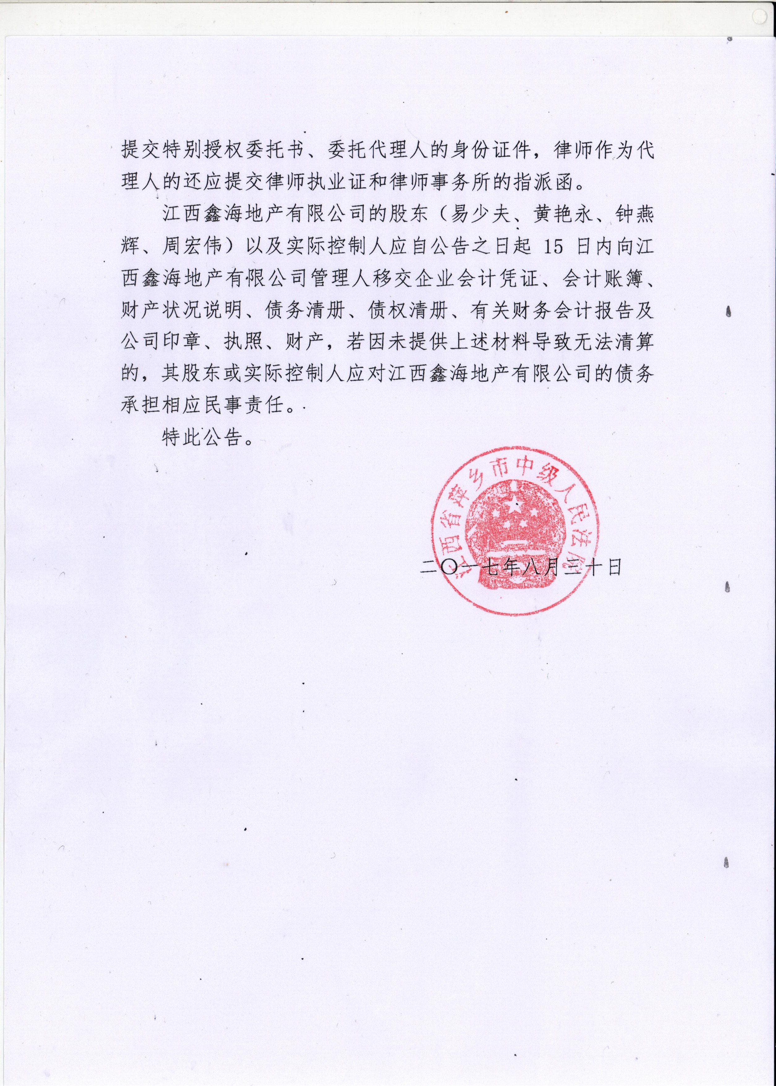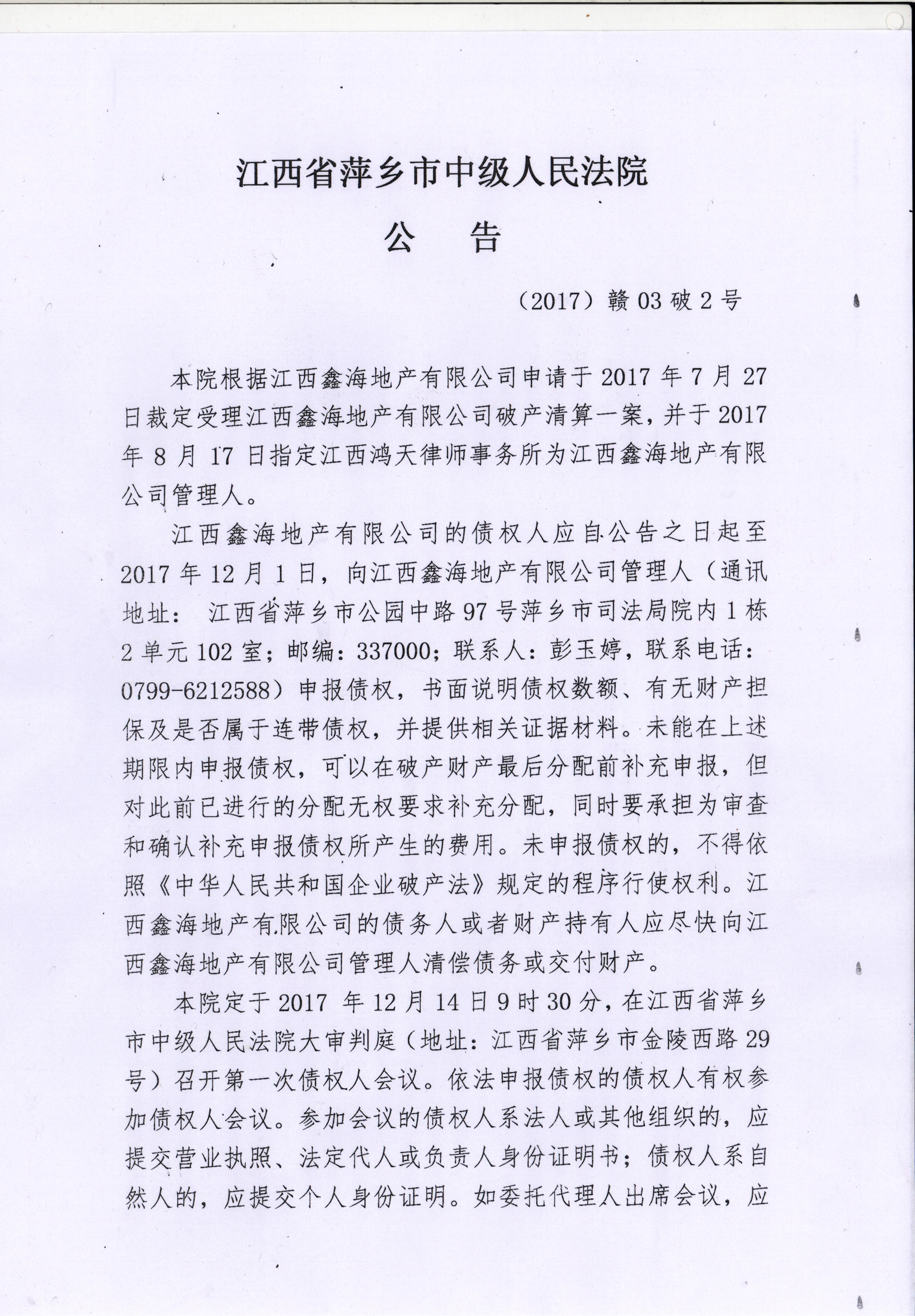 江西鑫海地产有限公司债权申报须知