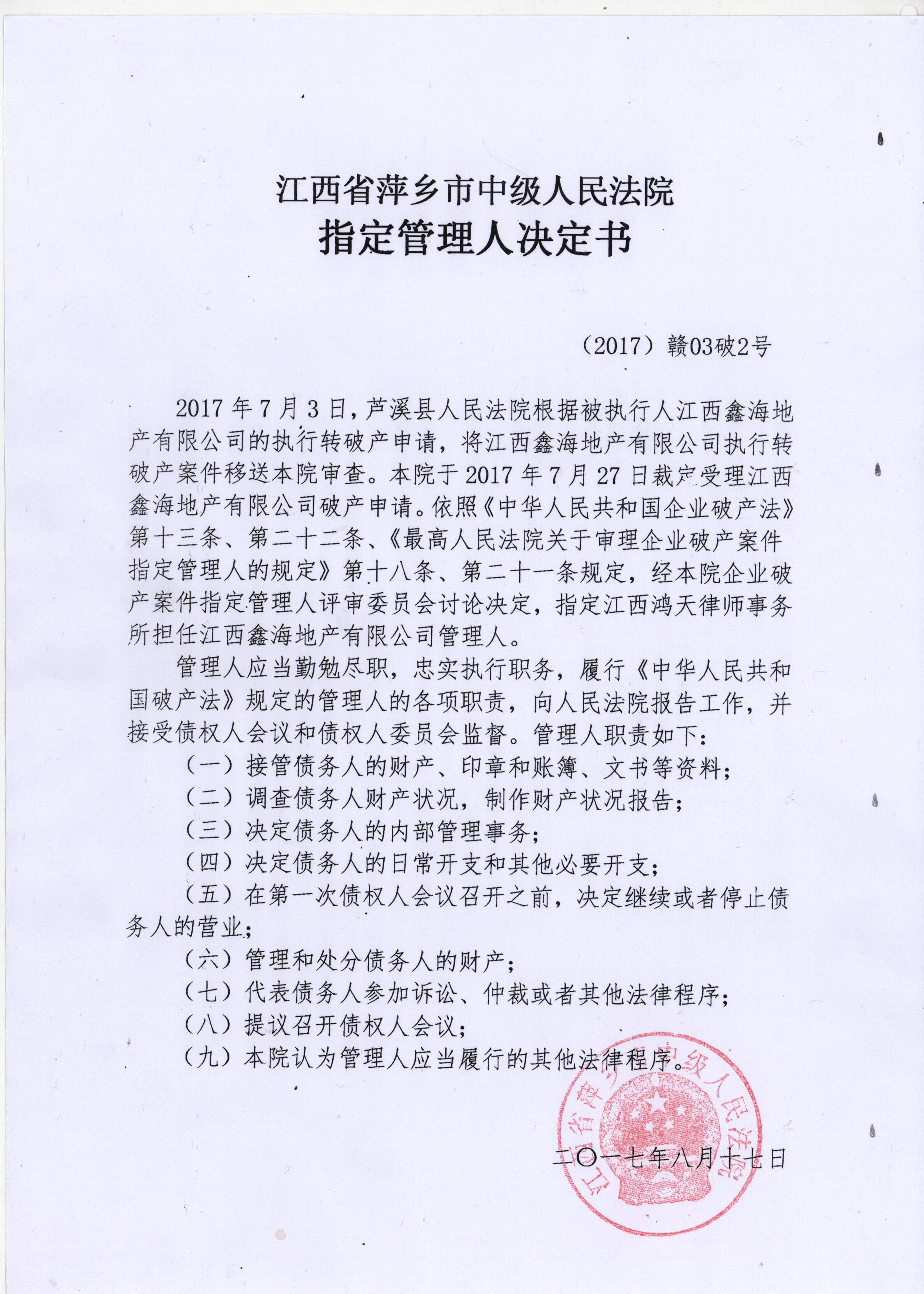 江西鑫海地产有限公司管理人决定书